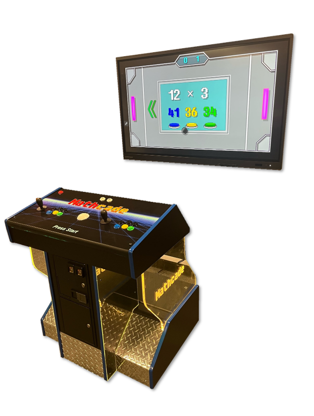 Mobile arcade cabinet with a retro feel. Plugs up to TV or projector (monitor not included). Includes games: Math Pong, Sliders, Space Bubbles and Math Wizard TD. Contact for a quote.
